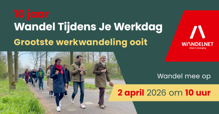 Donderdag 2 april 2026 is het zover: de 10e editie van Wandel Tijdens Je Werkdag. En dat wordt gevierd met de grootste werkwandeling ooit. Om 10.00 uur organiseert Wandelnet een gezamenlijke wandeling door heel Nederland. Je kunt meedoen vanaf je kantoor, thuiswerkplek of coworking locatie.